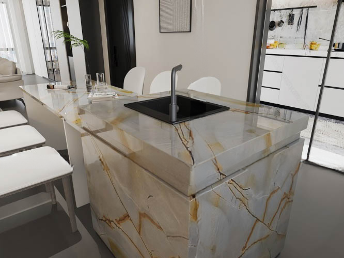 Hiệu ứng vân đá giúp bàn đảo trở thành điểm nhấn nghệ thuật trong căn bếp.