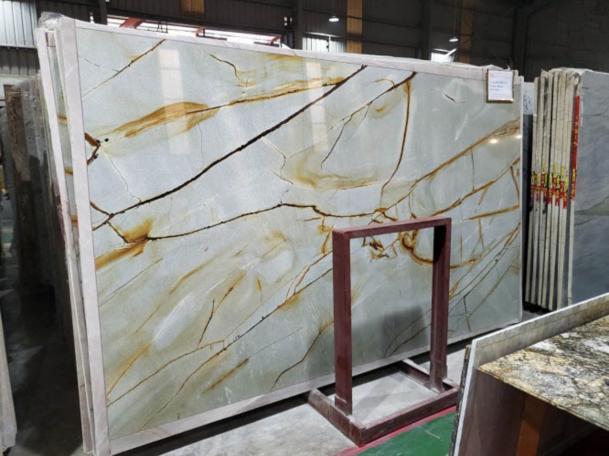 Đặc trưng của mẫu đá này chính là nền xanh thiên thanh – xanh đá trời phối cùng những đường vân vàng nâu – xám bạc được đan kết tinh tế giống như những mảng màu trong nghệ thuật trừu tượng. Mỗi tấm đá giống như một bức tranh thiên nhiên sống động, mang đến sự cuốn hút khó cưỡng.