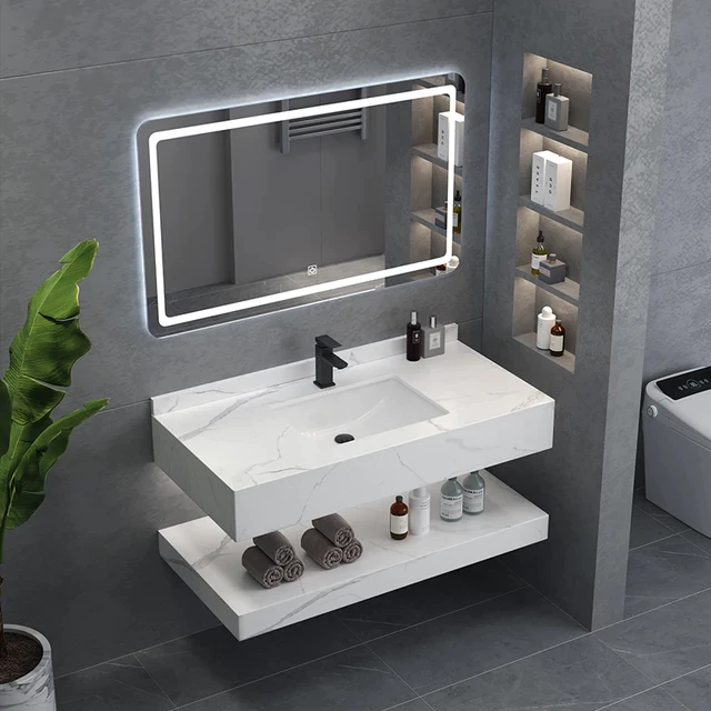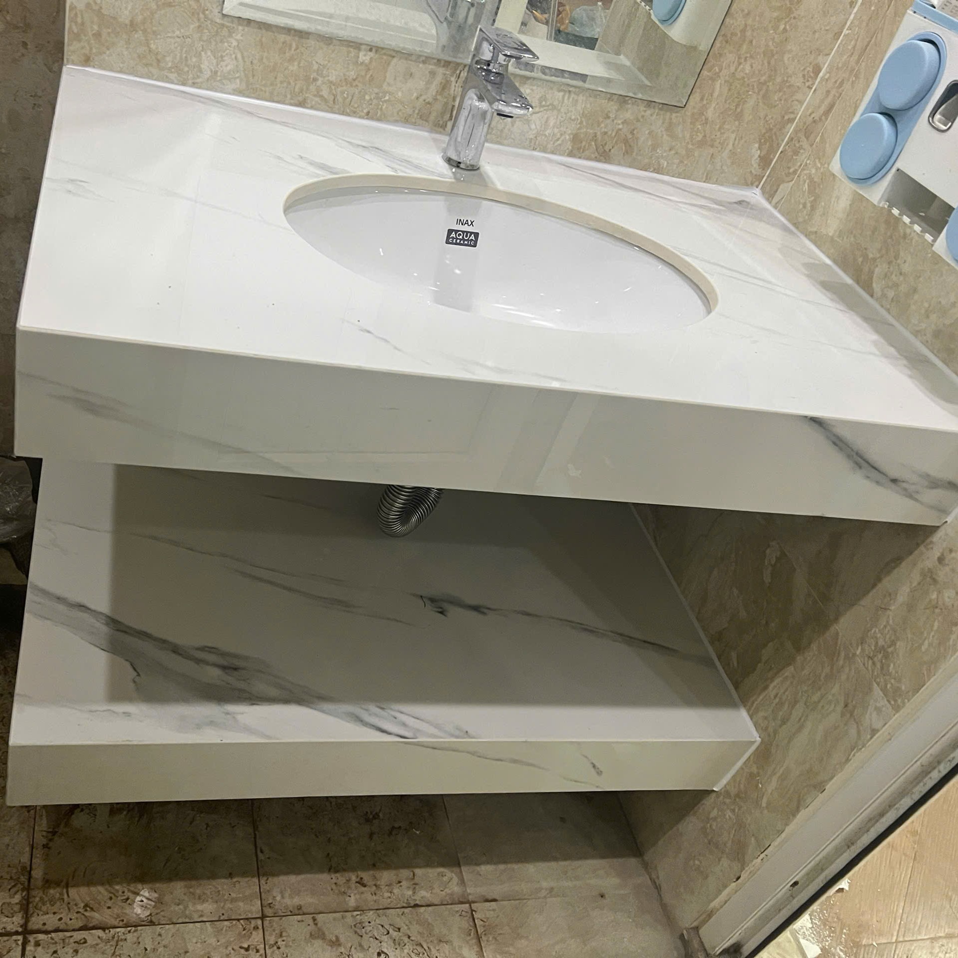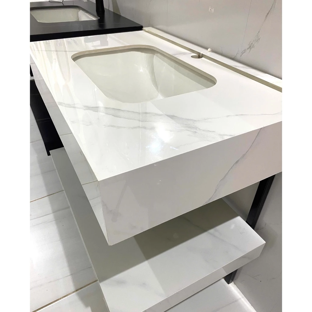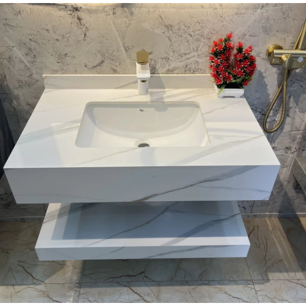 Bàn đá đôi lavabo chống xước ,đá Lamar ép nung – vân đá trắng – 02