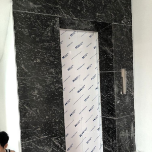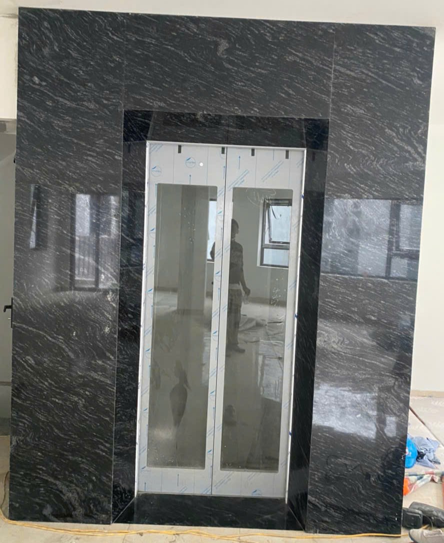 Đây là ứng dụng phổ biến nhất. Lớp đá đen với vân rừng tự nhiên giúp khu vực thang máy nổi bật ngay lập tức.