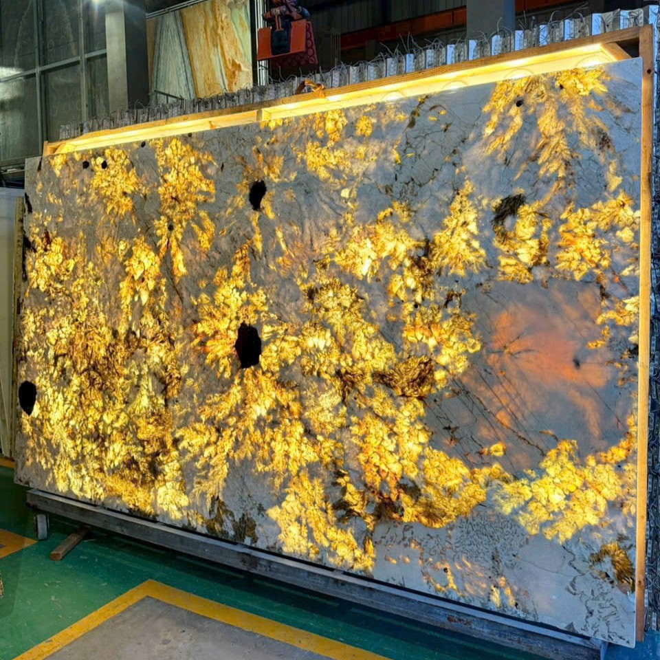 Khả năng truyền sáng cao của đá Alpinus kết hợp với đèn LED tạo ra ánh sáng mềm mại, ấm áp, làm nổi bật đường vân và sắc đá, biến vách tường trở thành tác phẩm nghệ thuật ánh sáng trong phòng khách, sảnh hoặc quầy lễ tân.