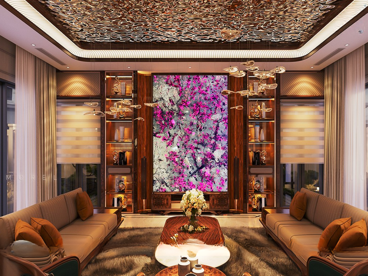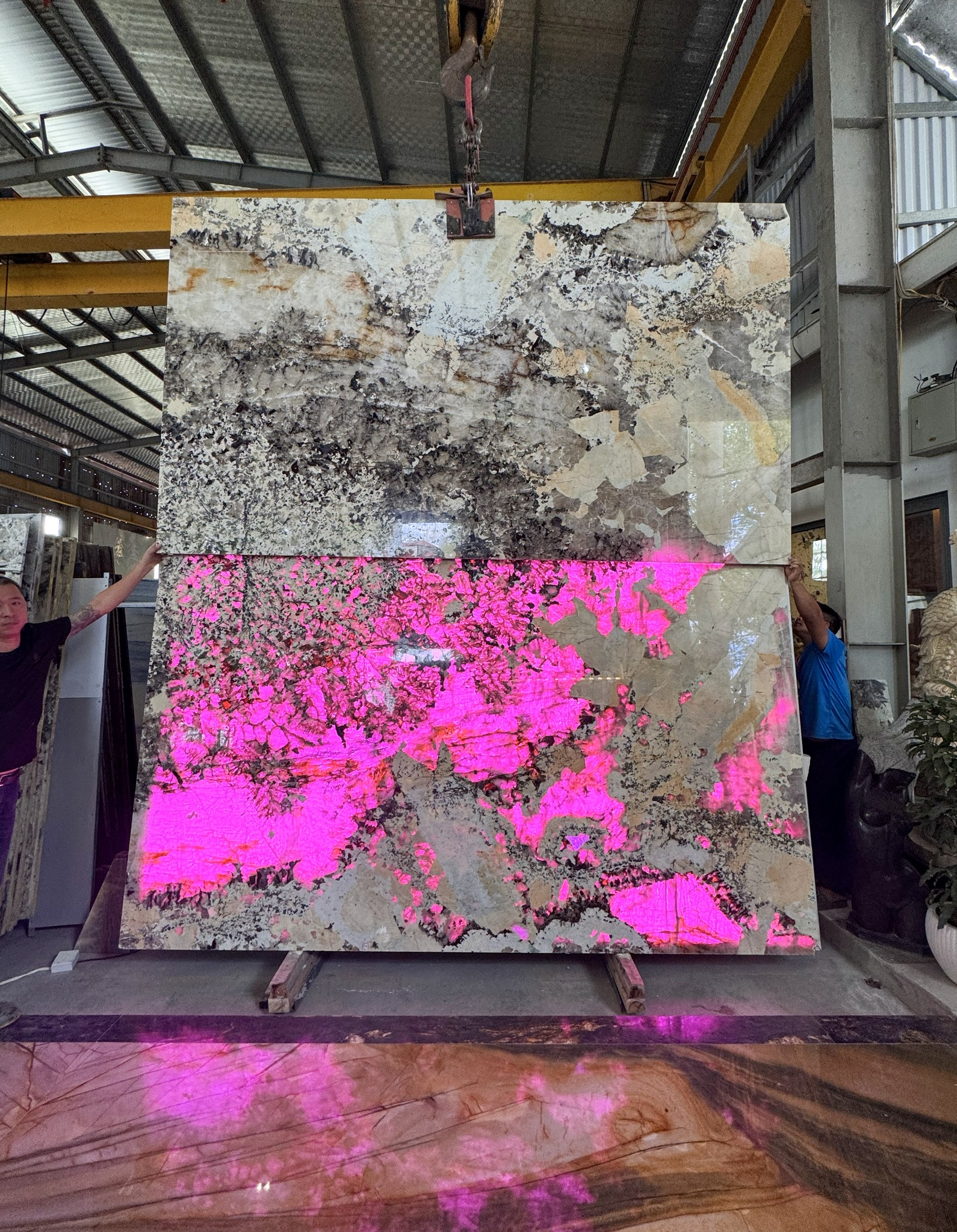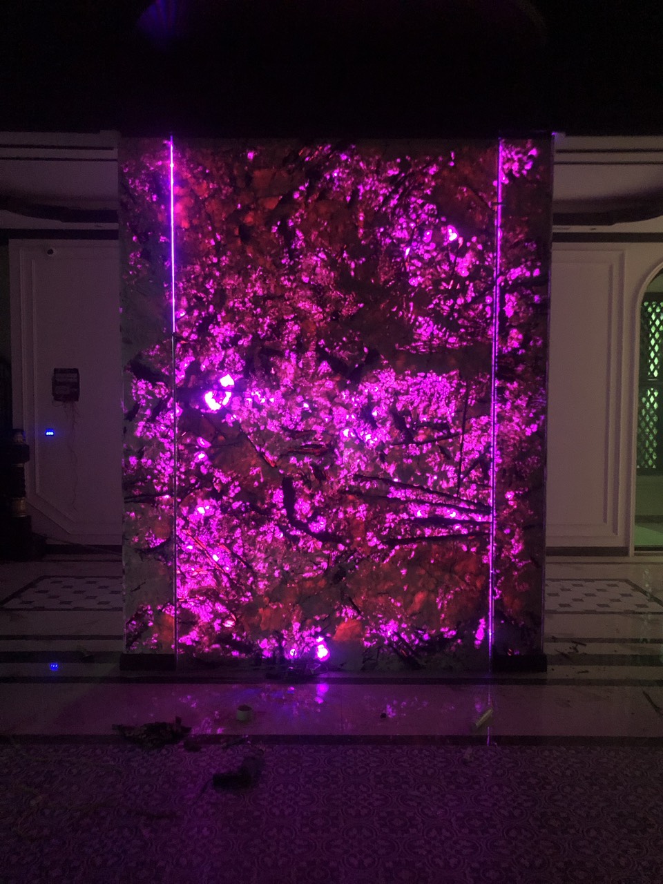 Với khả năng xuyên sáng tự nhiên kết hợp hệ đèn LED tùy chỉnh (vàng hoặc tím), bức tranh trở thành một tuyệt tác nghệ thuật, vừa mang vẻ đẹp nguyên sơ của thiên nhiên, vừa tạo hiệu ứng ánh sáng sống động và đầy mê hoặc. Đây là lựa chọn lý tưởng cho những công trình yêu cầu sự đẳng cấp, độc nhất, và bền vững theo thời gian.